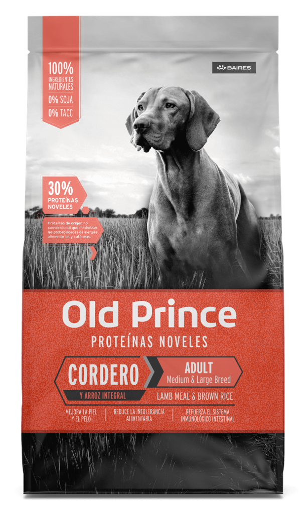 Harina de cordero, arroz integral, arveja, gluten de maíz, germen de maíz desgrasado, grasa animal (pollo), aceite de salmón (fuente de omega 3 y 6), hidrolizado proteico de menudencias vacunas, porcinas y aviares, pulpa de remolacha(fuente de fructo-oligosacáridos – FOS), levadura de cerveza, zeolita, sal, extracto de yucca schidigera, manano-oligosacáridos – MOS, nucleótidos de levadura, carbonato de calcio, dipropionato de amonio, ácido propiónico, acetato de zinc, pirofosfato ácido de sodio, glucosamina, condroitin sulfato, colágeno hidrolizado, ascorbato de manganeso, metionina, antioxidantes naturales: extracto de romero, vitamina C, betacaroteno, ácido cítrico, tocoferoles, licopeno, luteína, polifenoles, taurina,vitaminas: A, D3, E, K, B1, B2, B6, B12, ácido fólico, ácido nicotínico, ácido pantoténico, biotina, colina, minerales: zinc, hierro, cobre, yodo, selenio.