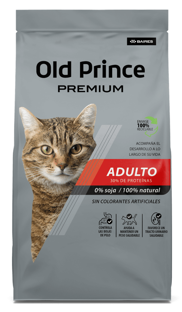 Harina de pollo, arroz, gluten de maíz, harina de pescado, harina de carne vacuna, arveja, aceite de pollo, aceite de pescado (fuente de omega 3 y 6), pulpa de remolacha (fuente de fructo-oligosacáridos-FOS), levadura de cerveza, hidrolizado proteico de menudencias porcinas, sal yodada, fibra insoluble (celulosa), acidificante en polvo (bisulfato ácido de sodio), extracto de yucca schidigera, L-carnitina, lisina, taurina, metionina, ácido cítrico, lecitina, tocoferoles, extracto de romero, dipropionato de calcio, ácido propiónico, núcleo vitamínico-mineral; vitaminas A, D3, E, K, B1, B2, B6, B12, ácido fólico, ácido nicotínico, pantotenato de calcio, biotina, colina, minerales; zinc, hierro, cobre, yodo, manganeso y selenio.