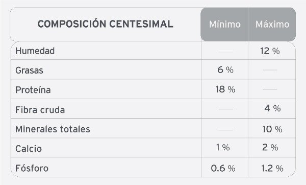 Harina de carne, harina de pollo, trigo, arroz, maíz, gluten de maíz, germen de trigo, harina de soja micronizada, levadura de cerveza, grasa de pollo y aceite vegetal preservados con antioxidantes naturales, aceite de pescado (fuente de omega 3), extracto de yucca schidigera, saborizantes naturales (hidrolizado de hígado de cerdo), BHT, BHA, vitaminas A, D3, E, K, B1, B2, B6, B12, ácido fólico, ácido nicotínico, pantotenato de calcio, biotina, colina, minerales: zinc, hierro, cobre, yodo, manganeso y selenio.